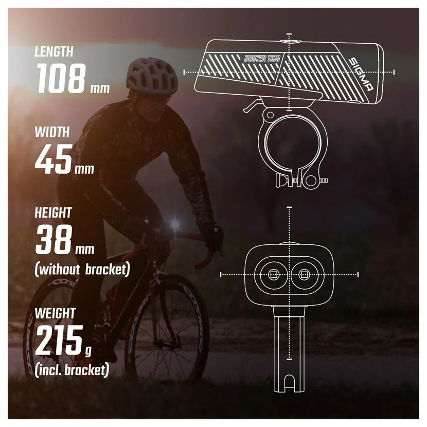 - 6 light modes: High (1100 lm), Mid (800 lm), Low (400 lm), Eco (150 lm), Night Flashing (800/400 lm), Day Flashing (200 lm)