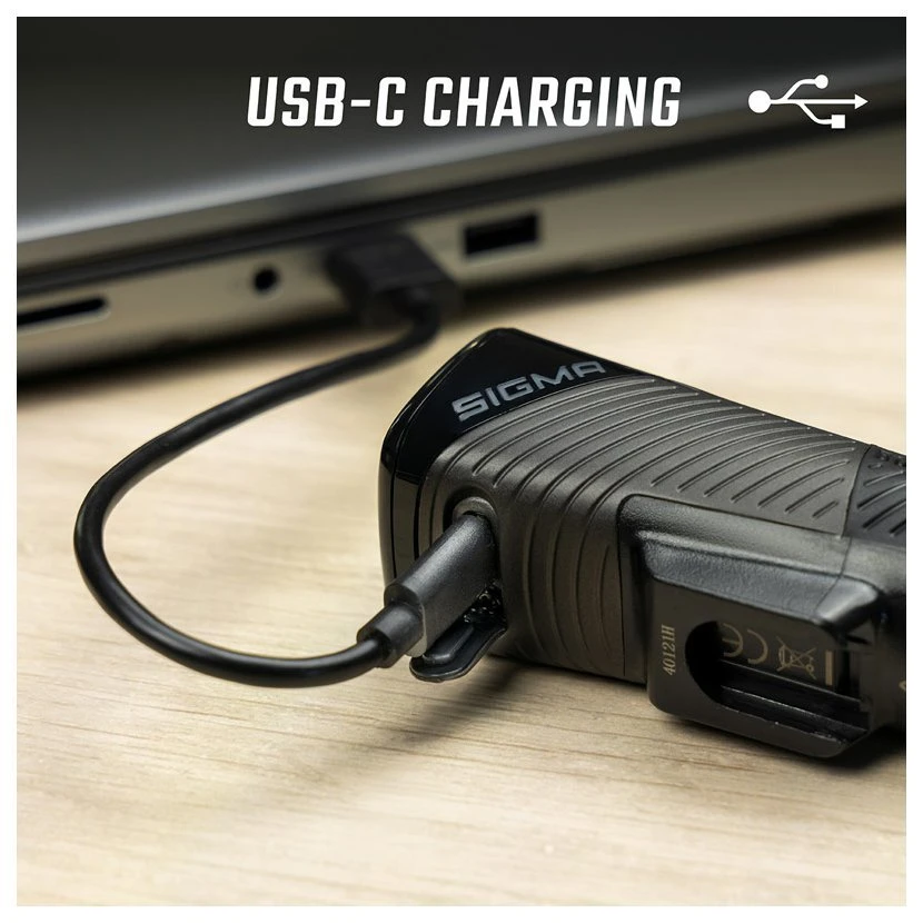 Front LED light with a luminous flux of 800 lumens and charging via USB-C.