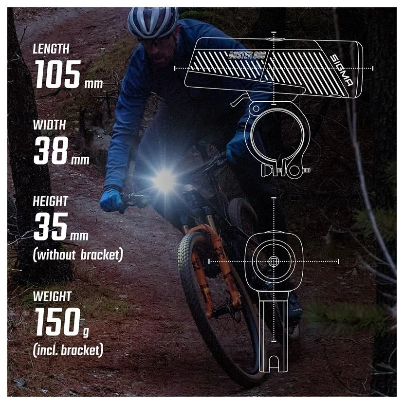 - 5 light modes: High (800 lm), Mid (400 lm), Low (150 lm), Night Flashing (600/200 lm), Day Flashing (200 lm)