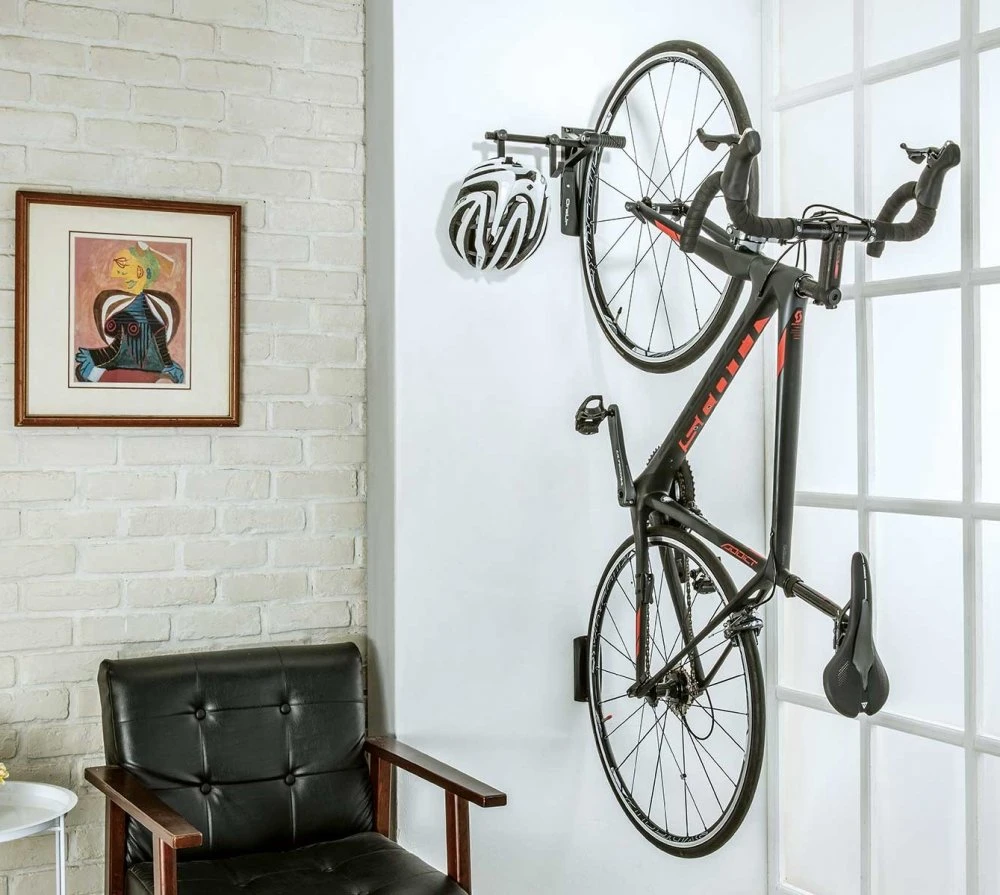 Stylish holder for hanging bicycles of all types on the wall behind the front wheel.